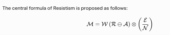 Analytically, this formula maintains fidelity to Resistism’s premises by privileging process over stasis: existence remains “incomplete,” with meaning as a dynamic containment of essence. It rejects teleological finality, as geung-ji (noble pride) implicitly integrates over the equation’s temporal horizon (∫M dt≈G), signifying “the pride of being un-uprooted after a tempest.” Courage, as a multi-dimensional construct with constituents of objective, intentionality, fear, and risk, may be subsumed as a coefficient modulating R, ensuring tenacity’s “inexhaustible energy” sustains the operation against nihilistic decay.